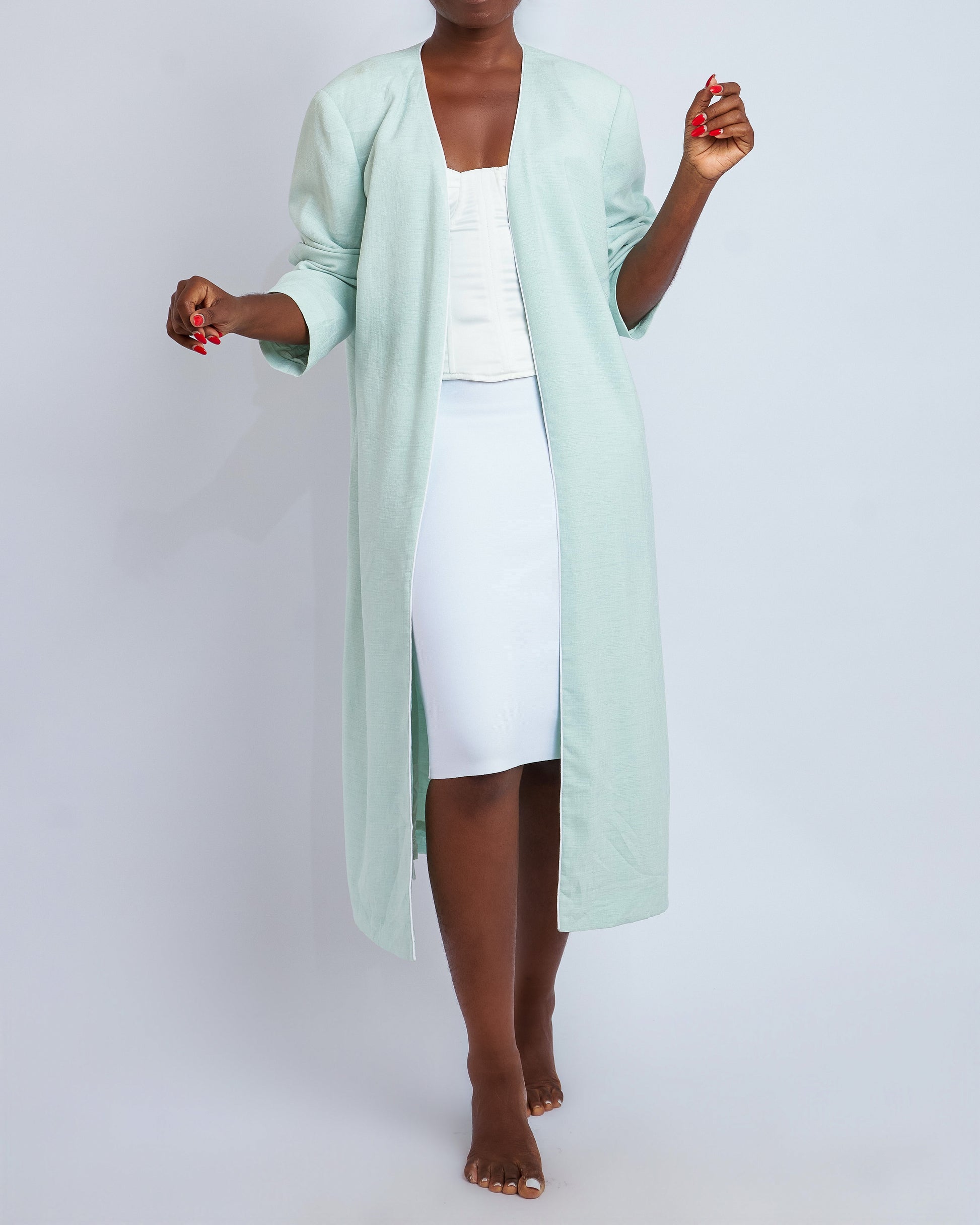 Mint green duster coat with white piping